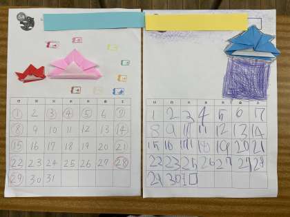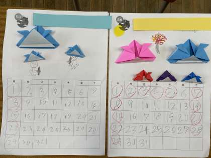 5月のカレンダー作りでは,おりがみでかぶとを折りました。