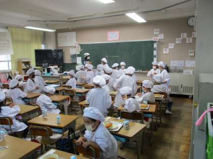 1年生は給食が始まって1週間と少しが経つころですが、今日は自分達だけで盛り付けも行っていました。同じ量ずつ入れるのは難しいですが、上手に盛り付けしていました。