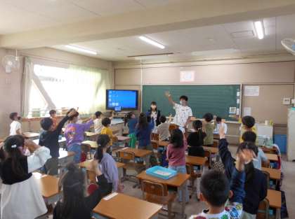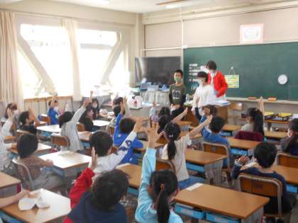 6年生の児童会役員と代議員の2名が,1年生の各教室に出向き,歓迎の言葉を伝えました。優しいお兄ちゃんやお姉ちゃんと学校クイズやじゃんけん等を一緒にして,とても楽しそうでした。