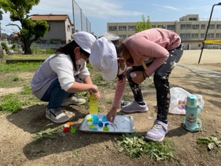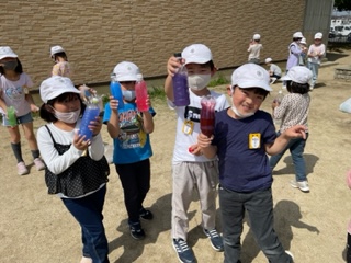 2年図工「ひかりのプレゼント」色水づくり 公開日 2022/05/09 更新日 2022/05/09 2年 持ってきたペットボトルに水と絵の具を入れて,たくさんの色水を作りました。混ぜ方を工夫していろいろないろのボトルができて,とても楽しそうでした。