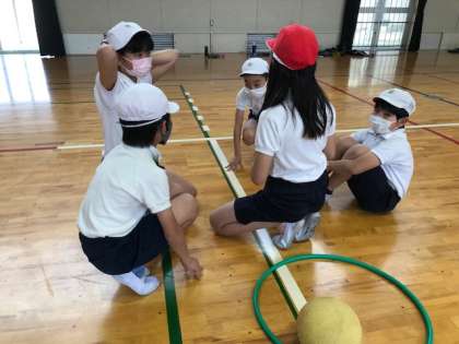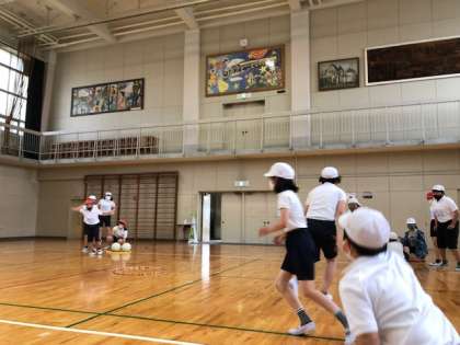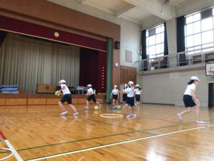 6年生 体育「セブンボール」1 公開日 2022/05/10 更新日 2022/05/10 6年 体育の学習では,「セブンボール」を行いました。コート中央にある7つのボールから,自陣コートにあるフラフープの中に3つのボールを確保できれば,勝利というゲームです。今回は,大盛り上がりで試しのゲームをしました。