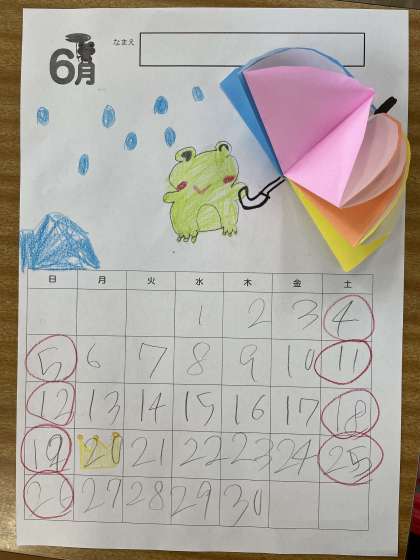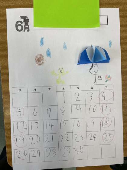 自立活動の時間に6月のカレンダーを作りました。折り紙を貼り合わせて立体的な傘を作りました。雨が降っているから・・・とカエルや魚,雨,水たまりなどいろいろな絵をかいて自分だけのカレンダーを作っていました。