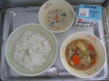 給食では「〇〇丼」や「混ぜご飯」などを出すことが難しいので、自分でかけたり、混ぜたりして作るメニューがあります。今日の「かけたらクリームドリア」もその一つで、ごはんにかけるとクリームドリアのようになります。別々に食べる事も出来ますが、かけるともっと美味しくなるので、おすすめです。