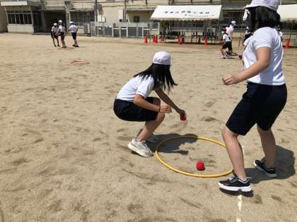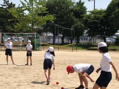 体育の学習で行っているセブンボールを運動場でも行いました。