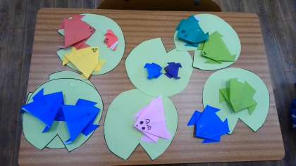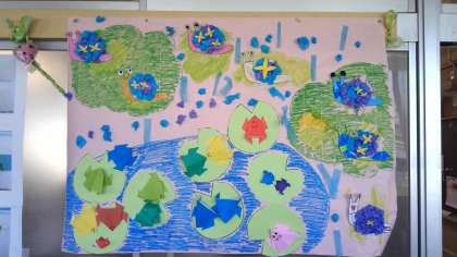 6月は梅雨の季節にちなんで,かえるとかたつむりを作りました。折り紙を使ってかえるの形を作りました。友達同士で「ここを折るんだよ。」と教え合いながら一緒に作ることが出来ました。最後にはみんなで大きな模造紙に色を塗って,完成させました。