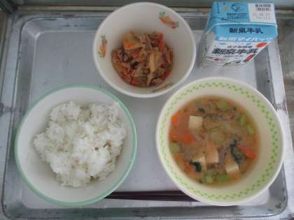 「うまうまハッピー豚丼」は、昨年度の大阪府学校給食献立コンテストで、西区の小学生が考えて応募し、入賞したメニューです。思いのこもった献立名が素敵ですね。豚肉、にんじん、たまねぎ、かまぼこなどが入っていて、かくし味に白ワインが使われています。