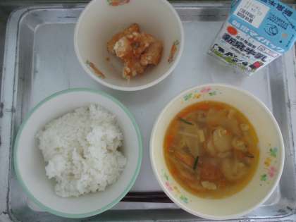 7月4日(月) 今日の給食 公開日 2022/07/05 更新日 2022/07/05 給食・食育 今日の献立は ・ごはん ・牛乳 ・ワンタン ・ユーリンチー でした。 ユーリンチー(油淋鶏)は、新登場のメニューです。揚げたから揚げに、長ネギやにんにくの入ったタレをかけています。