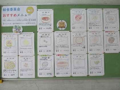 給食委員会おすすめメニュー 公開日 2022/09/05 更新日 2022/09/05 給食・食育 給食場前の掲示板には、6年生の給食委員会メンバーが書いた、「給食おすすめメニュー」を掲示しています。 メニューのイラストやおすすめポイントなどが書かれています。 ぜひ見てみてくださいね!