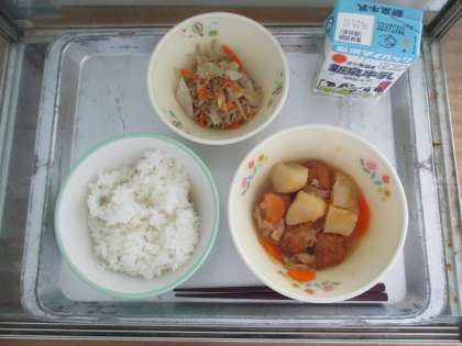 今日の献立は ・ごはん ・牛乳 ・豚肉と野菜のしょうが煮 ・ごぼうサラダ でした。