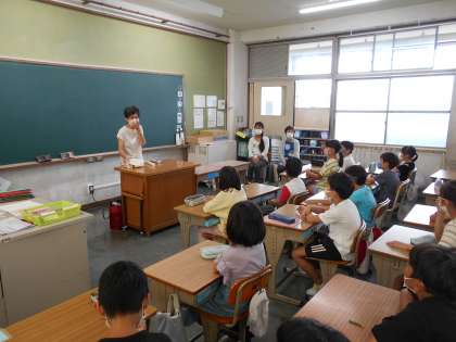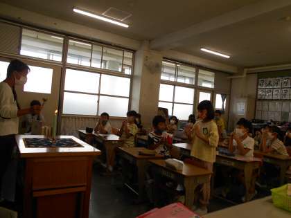 3年生「おはなしふくろう」 公開日 2022/09/27 更新日 2022/09/27 3年 堺市立西図書館の「おはなしふくろう」さんが子どもたちに,童話や絵本の読み聞かせにきてくださいました。 本が大好きな子どもたちは,おはなしを真剣に聞き物語の世界へ入り込んでいます♪ おはなしの最後にはうろうそくにみんなで願い事をし,火を消しました。