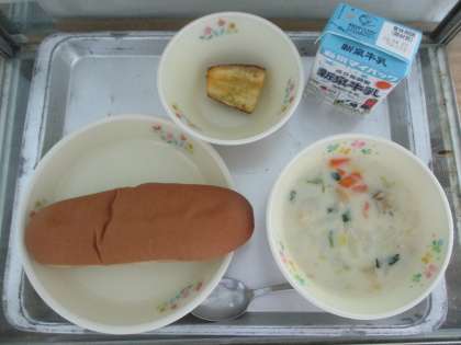 給食の焼きいもは、さつまいもに少しの油と塩をまぶし、オーブンで蒸し焼きにして作ります。シンプルですが、ほくほく美味しい秋の味です。