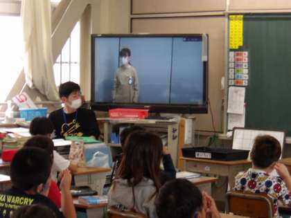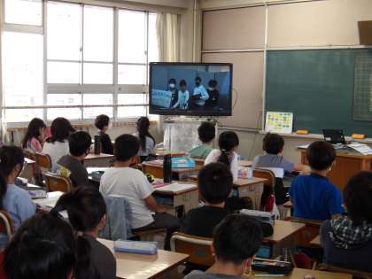 各教室で4年生の子どもたちが静かにお話を聞き、全校朝会に参加していました。