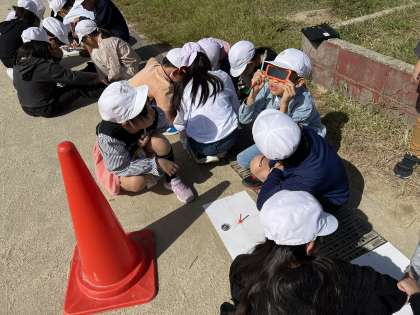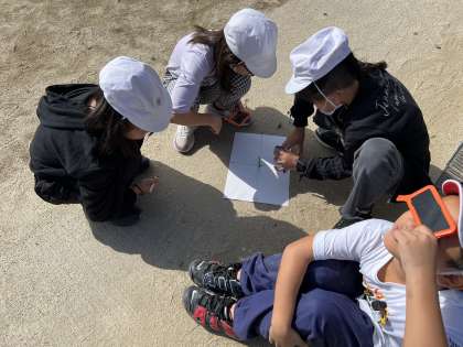 理科「かげと太陽」の学習で,かげと太陽の動きを観察しました。1日に何度も観察に行き,太陽が東から西に動くことを学習しました。実際に観察したことで,「太陽は本当に東から西に動くんだ!」と理解することができていました。