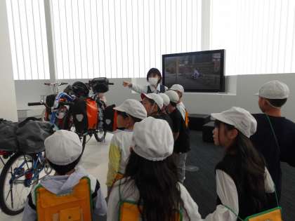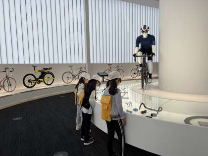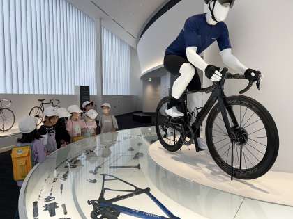 親子でつながって乗る自転車や,自転車ができるまにたくさんのパーツがあることに驚きながらも見学していました。