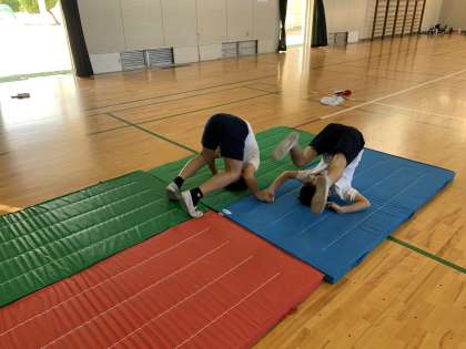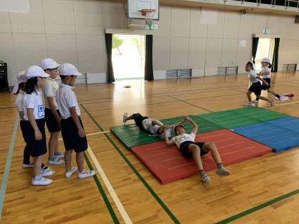 2年体育 マット運動 公開日 2023/10/19 更新日 2023/10/19 2年 体育館でマット運動に取り組みました。 練習を重ねるごとに、回り方も上手になり、「後転ができるようになった!」と嬉しそうに報告に来る子どもたちが増えました。一つ一つのポイントを押さえながら技の習得をがんばりました。