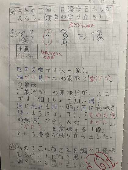 5年生 チャレンジノート「意味が深いで賞」 公開日 2024/05/14 更新日 2024/05/13 5年 今回のチャレンジノートは、国語の授業で学んだ「漢字の成り立ち」についてです。 漢字ができるまでをしっかり調べて分かりやすくまとめることができました。 小学生で学ぶ漢字は全部で1026文字です。 どれも大切な意味があるのでしっかり身につけていきましょう!