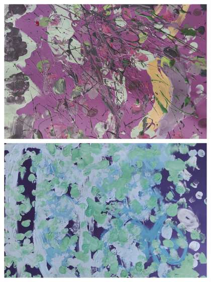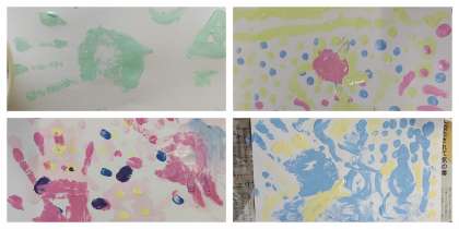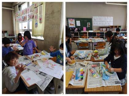 図工では、とろとろえのぐで絵をかいています。指先を使ったり手のひら全体を使ったりして、絵の具の感触を確かめながら、自由にかきました。