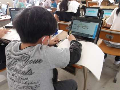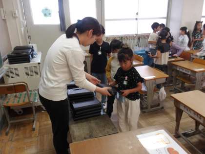 一人ずつにタブレットを渡して、今日はログインとシャットダウンの仕方を学びました。パスワードを入れるのに苦戦していましたが、頑張っていました。