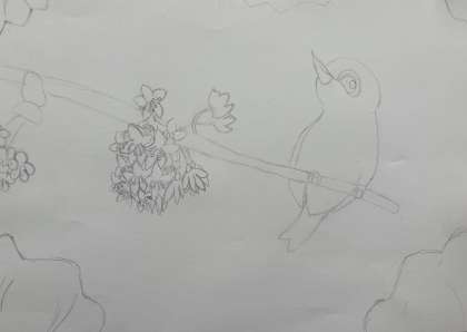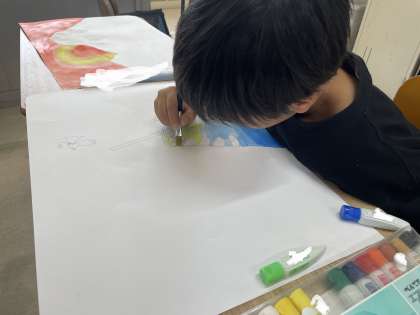 季節をイメージして、実際に学校の敷地を探して写真を撮ったものと、季節のイメージを合わせて自分だけの季節を感じる絵を描きました。完成するのがとても楽しみですね。
