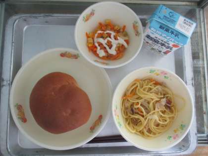 5月22日(水)今日の給食 公開日 2024/05/22 更新日 2024/05/22 給食・食育 今日の献立は ・黒糖きなこパン ・牛乳 ・ペペロンチーノ ・キャロットサラダ(マヨネーズ風ドレッシング) でした。