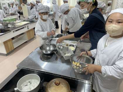 5年生 家庭科「調理実習」その1 公開日 2024/10/15 更新日 2024/10/15 5年 今回は、みそ汁とご飯に挑戦!! 初めてのご飯を炊くのに緊張しながらも班の友だちと協力して作りました。 自分で作ったご飯は格別ですね!