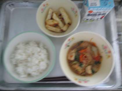 今日の献立は ・ごはん ・牛乳 ・とりすき ・さつまスティック でした。