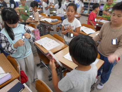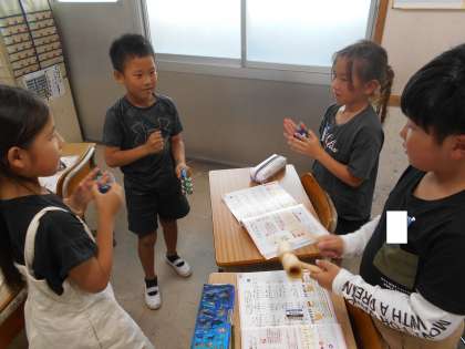 2年生 音楽科「山のポルカ」 公開日 2024/10/15 更新日 2024/10/15 2年 これまで学習してきた4分音符や4分休符,今回学習した8分音符や8部休符を使ったリズムをとりました。さらに,曲に合わせて合奏にもチャレンジしています。 「ウン」や「タン」の掛け声をかけながら協力するグループの姿もたくさん見られました。