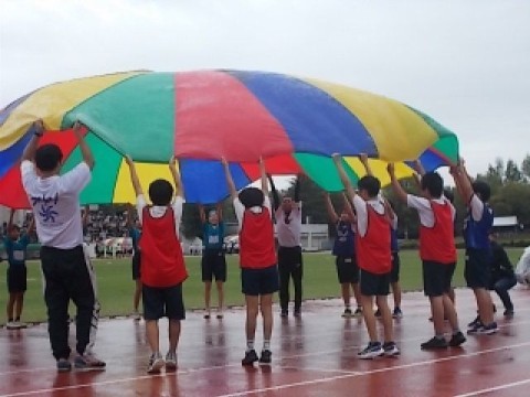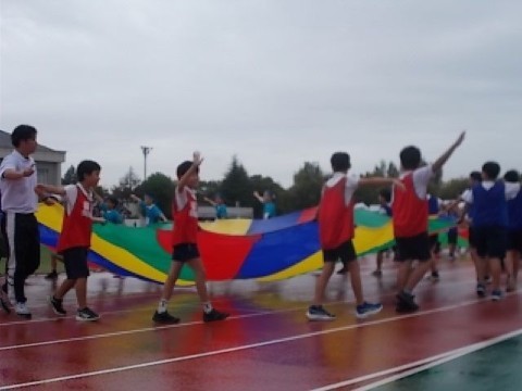 音楽に合わせて,上下に動かしたり,回ったりと他校の児童と協力して取り組むことができました。