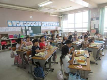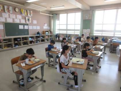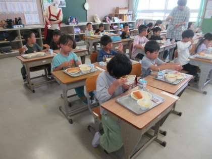 給食時間になりました。配膳を済ませ、各クラスから「いただきます!」と元気な声が聞こえてきました。カメラを向けると、みんなよい笑顔を見せてくれています。今日も美味しくいただきましょう。