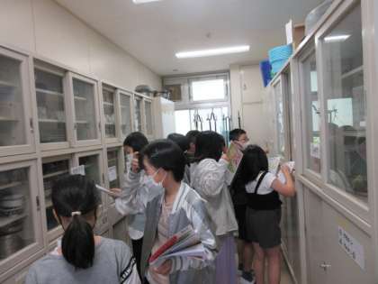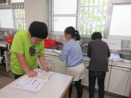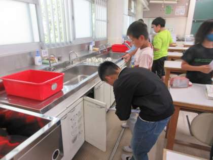 初めて家庭科室で授業を受ける5年生の子どもたち。家庭科室には調理器具や裁縫道具など、様々なものがあります。どんなものがあるのかを探検しました。恐る恐る引き出しを開けてみると、そこには見たことのない調理器具が並んでいました。家でよく見かける洗い桶なども見つかりました。