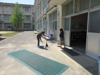 各学年の子どもたちが出入りする靴箱付近は、汚れが特に目立つ場所です。担当の子どもたちが協力して土を掃き出していました。