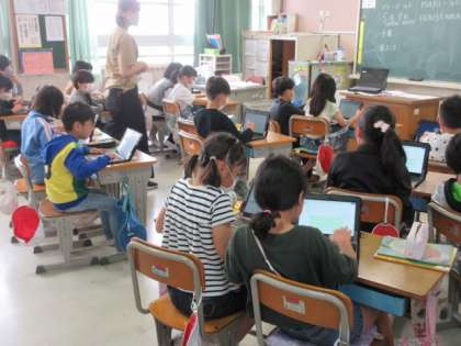 マリーゴールドやホウセンカの観察記録をタブレットを使って記録しています。