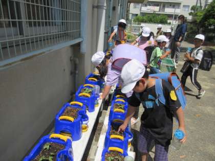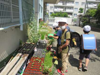 給食時間の後、低学年の子どもたちが下校しています。「花に水をたっぷりあげないと!」そう言って、1年生はアサガオに、2年生はホウセンカやマリーゴールドに水をあげていました。今日はお昼前から気温が一気に上がっています。家に帰ってからも水分をしっかり摂って、体調管理に気をつけましょう。