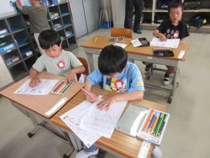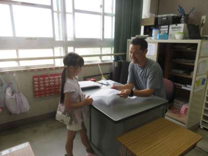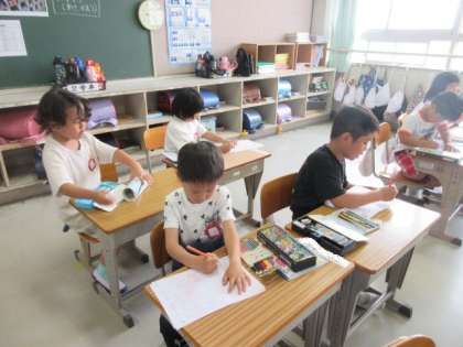 先生に丸つけをしてもらったひらがなプリントを返してもらっていた1年生の子どもたち。「やったぁ。全部まるだったよ。」「私は一つお直しがあったよ。」と、隣の席の友だちと話していました。お直しをして、先生からはなまるをもらいました。