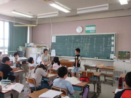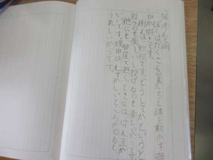 教科書の「考えと例」のページを学習していた4年生の子どもたち。例を挙げながら、自分の好きな遊びについてノートにまとめました。何人かの子どもたちが、みんなの前で自分の考えを発表しました。友だちの意見をしっかり聞いている姿を見て、さすが4年生です。頼もしく思いました。