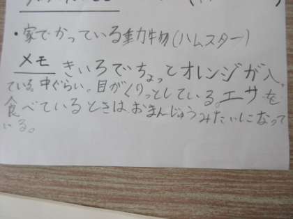 3年生は国語の時間に「もっと知りたいな、友だちのこと」の学習をしています。飼っている動物のことや好きなゲームのことなど、友だちに伝えたいことをメモに書きました。書いたことをどのように伝えるかを考えながら読む練習をしました。話す速度を変えたり、強弱をつけて話したりと、工夫して伝え合います。友だちに自分のことをたくさん知ってもらいましょうね。