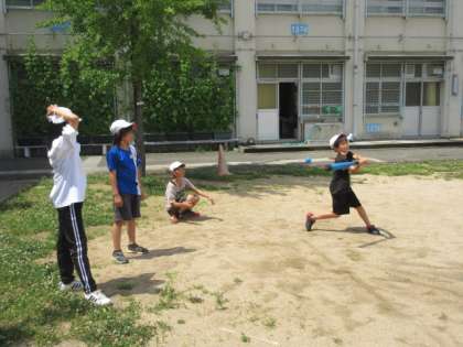 今日は天気が良く、気温も上昇しています。運動場に出ている子どもがいつもより少ないように感じましたが、子どもたちはこまめに水分を摂りながら走り回っています。先生と野球をしていた子どもたちを見かけました。色々な学年の子どもたちが入り混じって、「がんばれ!」と声をかけ合いながら仲良く遊んでいました。