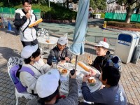 ミールクーポンを持って、各々の好きな食べ物を食べています。
