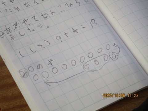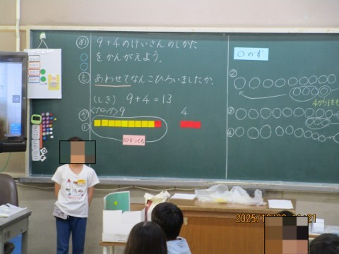 算数では,くり上がりのたし算を考えていました。図を使って,自分の考えを上手に友だちに伝えていました。