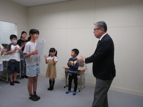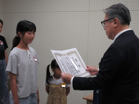 ・夏休み作品コンクールの表彰:シマノ自転車博物館 1年生Kさん、1年生Nさん、6年生Mさん
