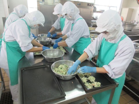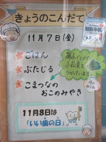 今日の給食は、歯を丈夫にするカルシウムが多い「小松菜のおこのみやき」です。堺市産の小松菜を使っています。新鮮でおいしい小松菜です。