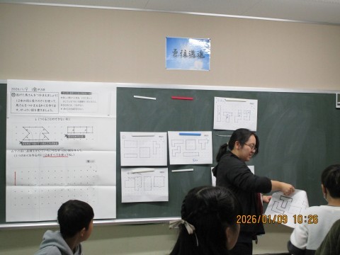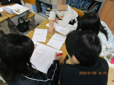 算数では、みんなで協力して図形を書いていました。たくさん思いついたかな?