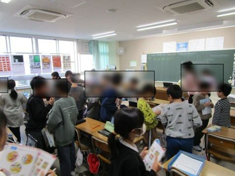 外国語では、友だちにインタビューして正解を探すゲームをしていました。