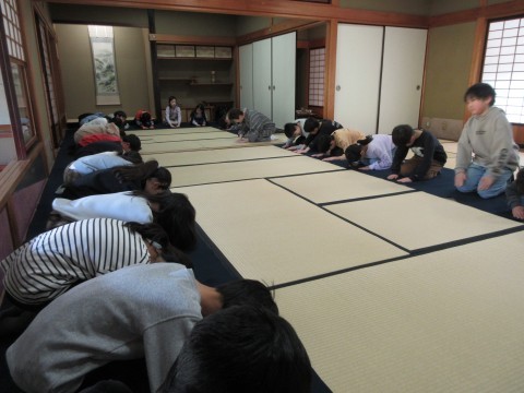 ①日本庭園で茶の湯の体験・・・お茶室に上がるときのマナー(靴のそろえ方や敷居や畳の縁を踏まない)を教えていただき、意識しながらお茶室へ入りました。足を崩すことなく、渦まき模様の干菓子(今回は、観世水という和三盆の干菓子)をいただきました。その後、裏千家流で点てていただいたお茶をいただきました。お辞儀の仕方、お茶碗の模様の見方、、、などなど教えていただきました。