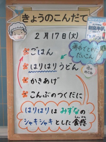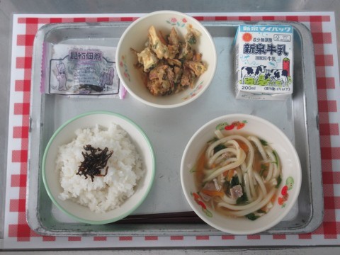 今日の給食では、豚肉・うどんを使って「はりはりうどん」としています。