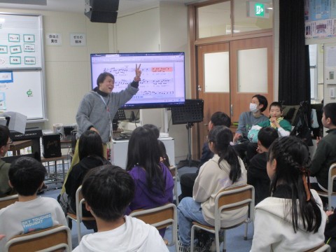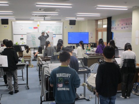 クイズやダンスで互いに紹介し合った後に、「ビリーブ」「にじ」の合唱をしたり、「キリマンジャロ」の合奏をしたりしました。