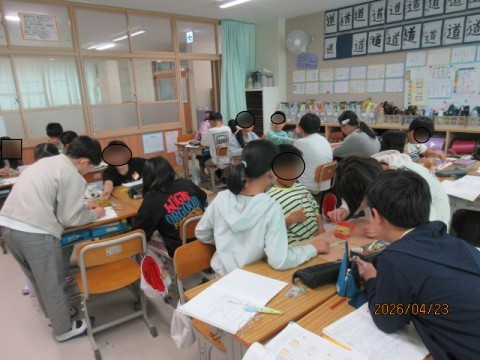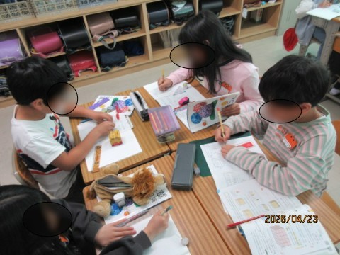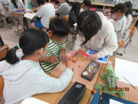図やブロックを使いながら、班で協力して答えを導き出そうとしています。どんな方法があるかな!?