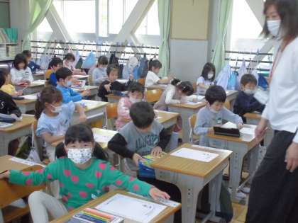 1年4組では、1時間目に運動場の探検をして気づいたものを絵に描いていました。