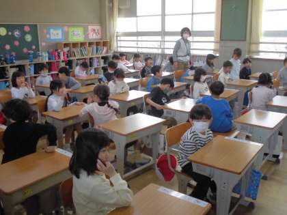 1年2組の教室では、机の高さを調整していました。