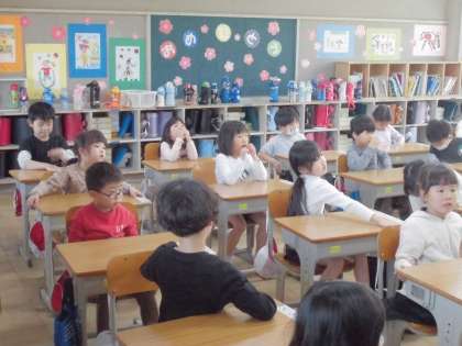先生が一人ずつ回り、イスに足が着いているかなど、チェックをしています。